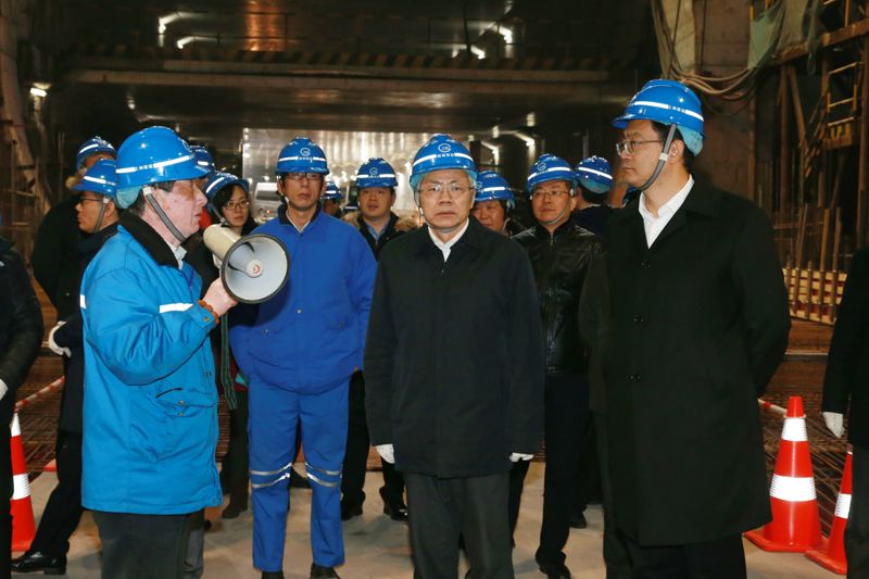 在中江路北横通道在建工程,汤涛副部长一行下施工井参观隧道内盾构作业施工现场,并听取上海隧道工程有限公司关于高技能人才培养基地建设和企业新型学徒制试点工作开展情况,了解参与试点的师徒心声。